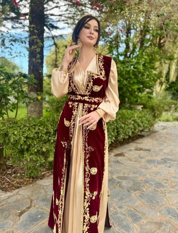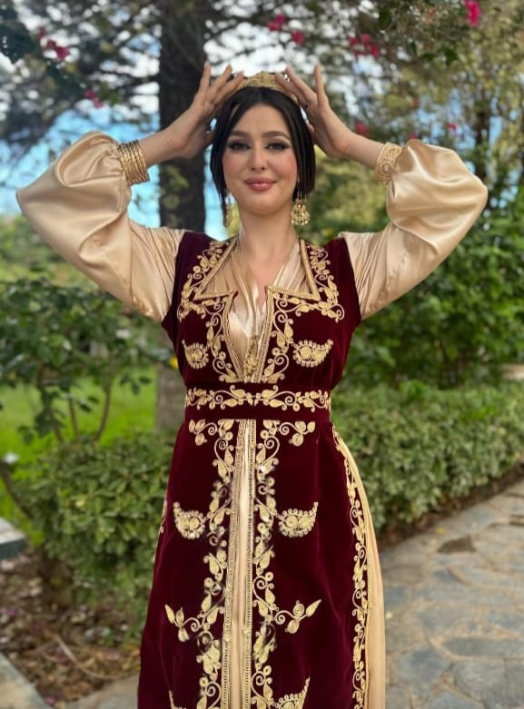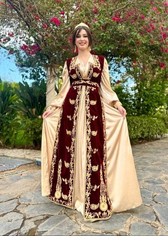 Le Caftan Algérien est une tenue majestueuse aux influences ottomanes, confectionnée en brocart, velours et ornée de broderies dorées. Porté lors des grandes occasions, il symbolise l’élégance et le raffinement du patrimoine algérien.