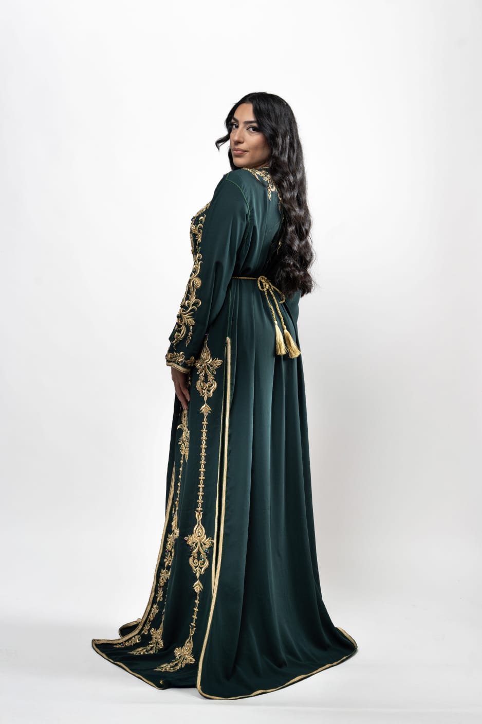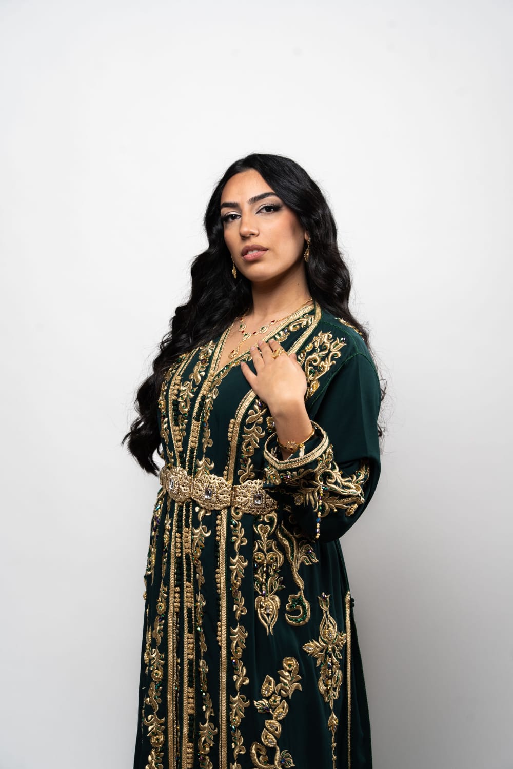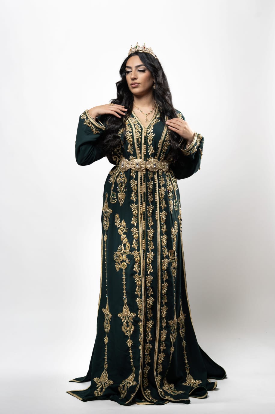 La Takchita est une somptueuse tenue traditionnelle d’inspiration marocaine, composée de deux couches superposées : une robe légère et un dessus brodé ou perlé. Elle incarne l’élégance et le raffinement, idéale pour les grandes occasions.